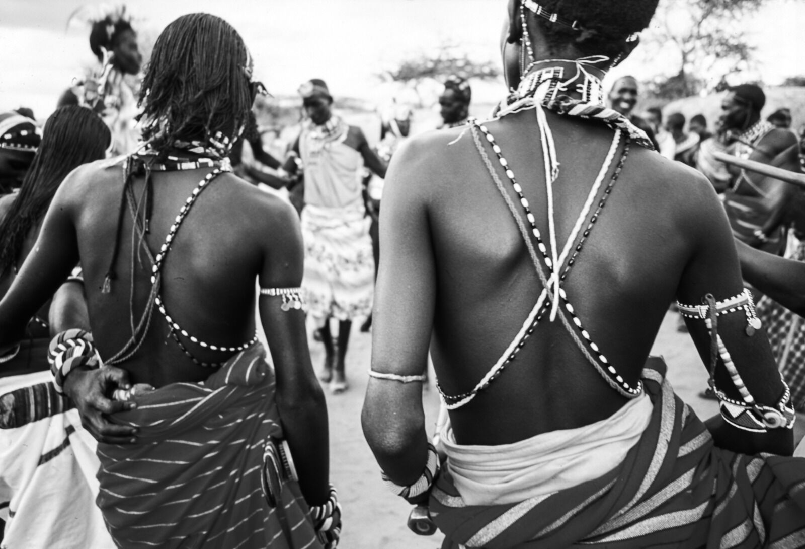 The Samburu. The Samburu tribe of Northern Kenya are distant cousins of the Massai. I was fortunate to visit one of their bomas well before tourism started to impact. I only had with me a small film camera, but it was discreet and I worked in close. This image was caught one afternoon when the young men started practicing their dances, which (like the Massai) included jumping to a great height. Of the many photographs I took, this one captured their enthusiasm.